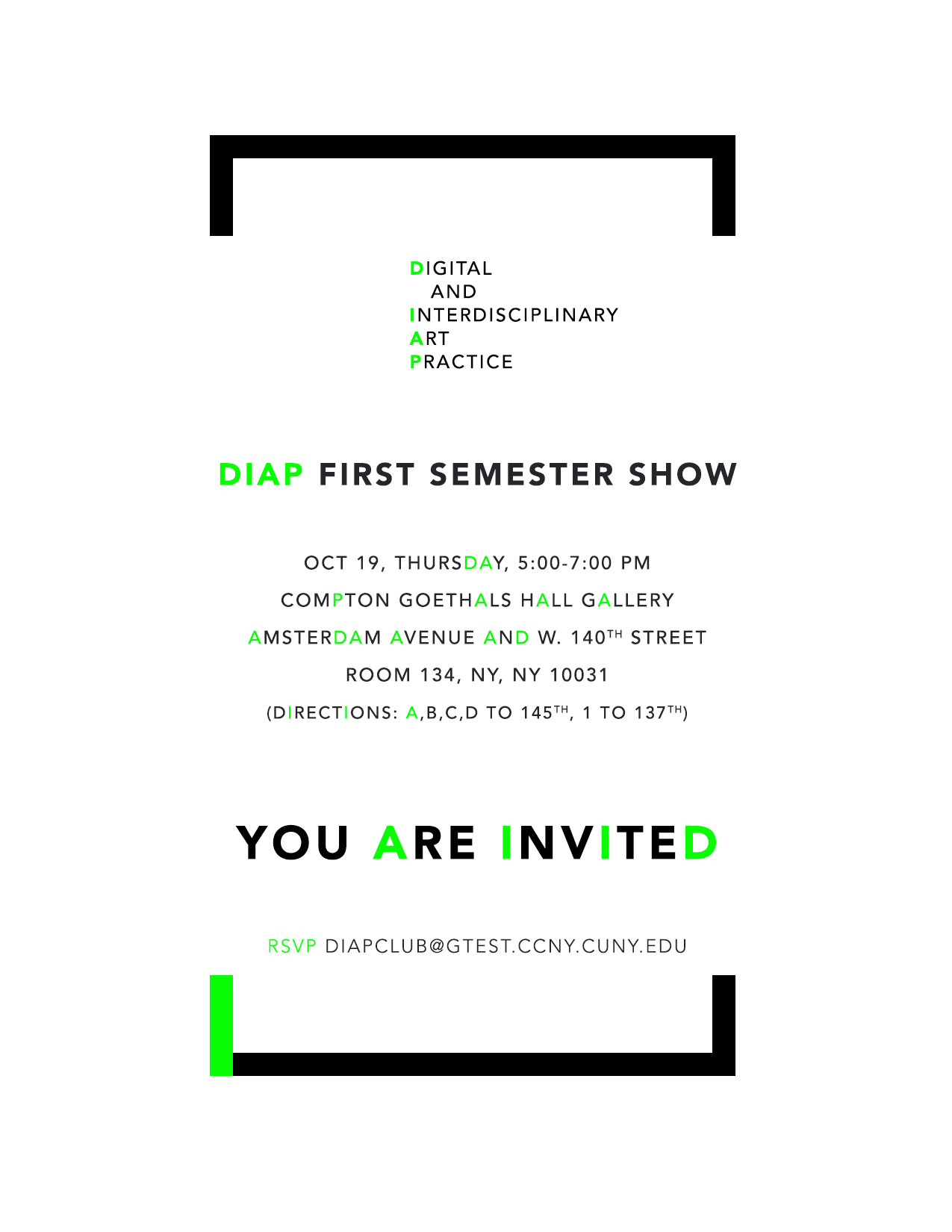 announcements events exhibition DIAP First Semester Show October 2017 by DIAP_MFA November 1, 2017October 29, 2019 Post navigation [DIAP] MFA Alum Jennifer Seastone solo exhibition at Invisible Dog NYDIAP Thesis Development Presentations 2017