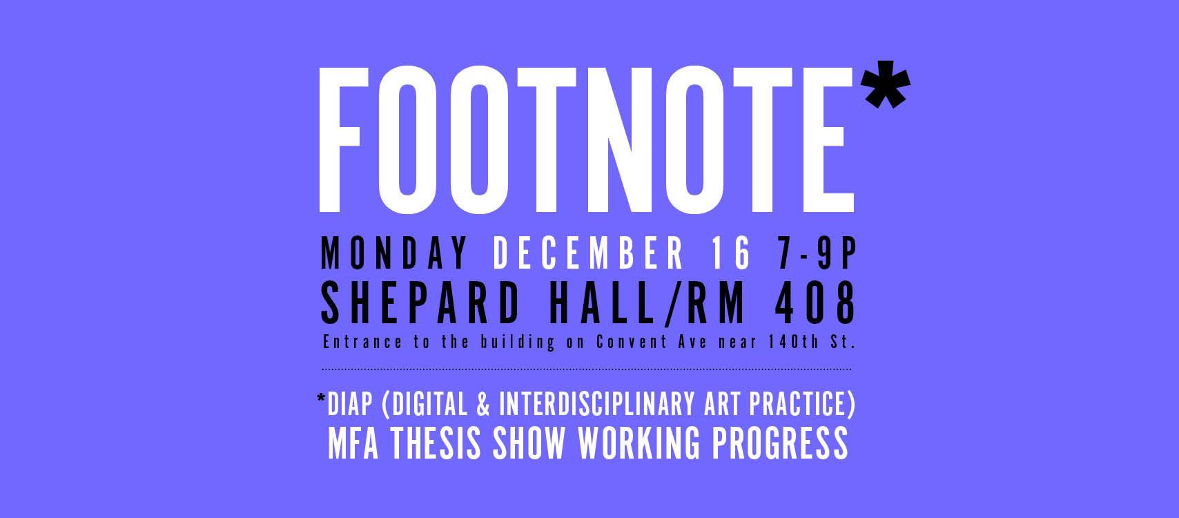 FOOTNOTE* a presentation of work in progress by the 2nd-year DIAP MFA students. Come see and hear what they are panning for their upcoming Spring 2020 MFA Thesis shows!
